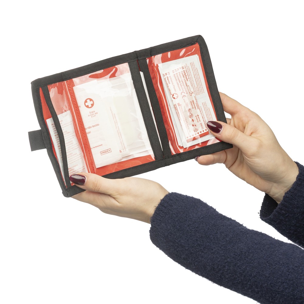 RPET 600D poliészterből készült elsősegélytasak tépőzárral és hordozópánttal. Tartalma: 5 sebtapasz, 1 steril fedőkötés, 1 nemszőtt törlőkendő, 8 alkoholos törlőkendő és 2 tisztítókendő. A külső felületen rPET címke található.
