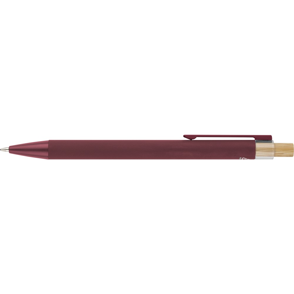 Újrahasznosított alumíniumból készült golyóstoll bambusz nyomógombbal és AS műanyag díszítéssel, fém klippel és a toll színével harmonizáló műanyag tollheggyel. A tolltesten lézergravírozott recycled (újrahasznosított) alapanyagra utaló logó található. Megközelítőleg 800 méter íráshosszúságú, kék színű tollbetéttel.