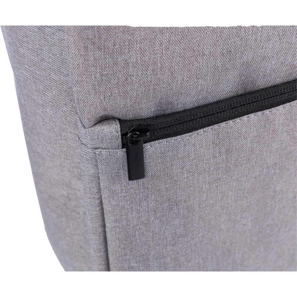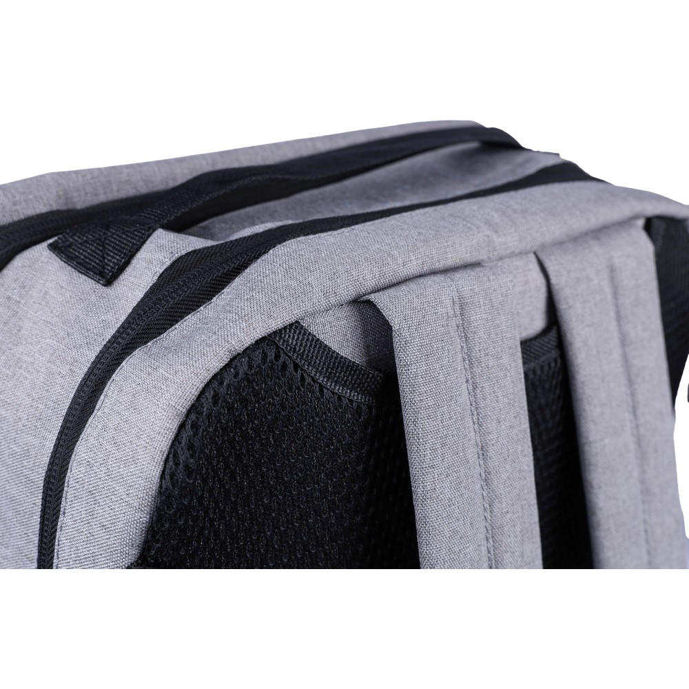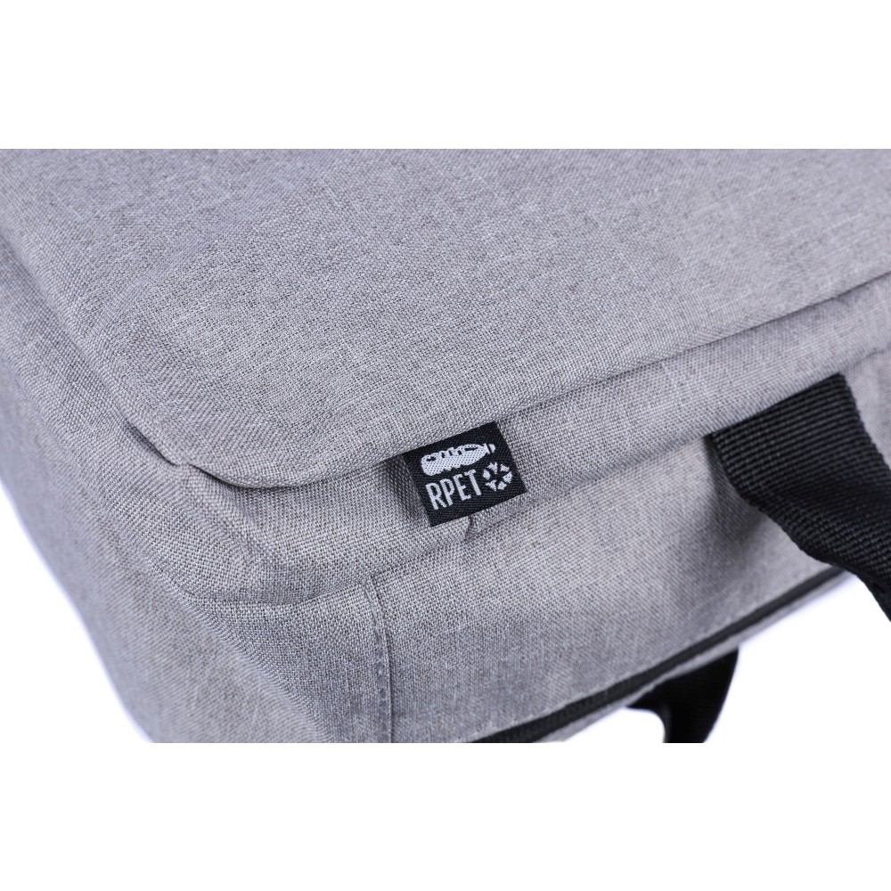 Hátizsák és laptoptáska 15 -es készülékhez. Kézipoggyász méretű. Hordozófüllel a tetején, állítható vállpántokkal és két oldalsó fogantyúval. Az állítható pántok a párnázás mögé rejthetők, így az oldalsó fogantyúkkal is hordozható. Tépőzáras laptoprekesszel és kis cipzáras zsebbel rendelkezik. Szellőző, párnázott hátoldallal. Terhelhetősége kb. 8 kg. RPET alapanyagra utaló címkével. Anyaga: 300D RPET poliészter.