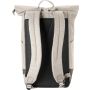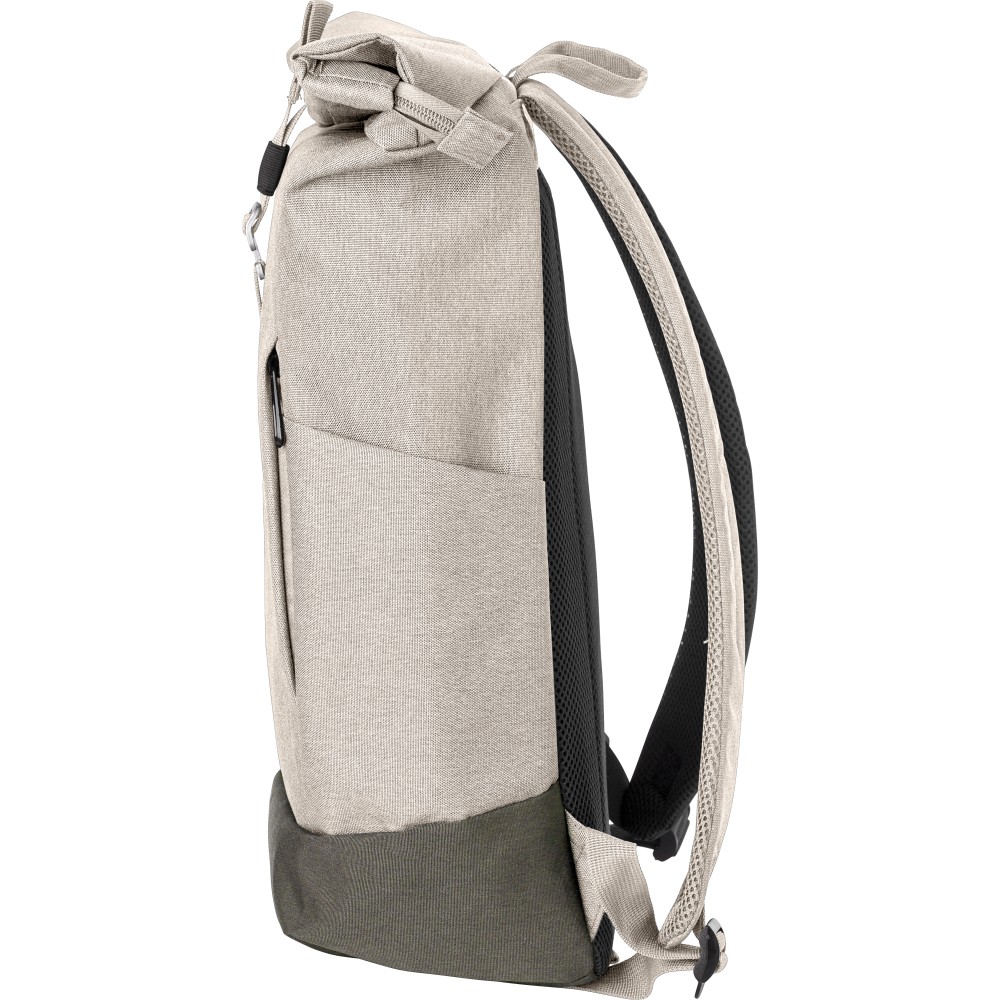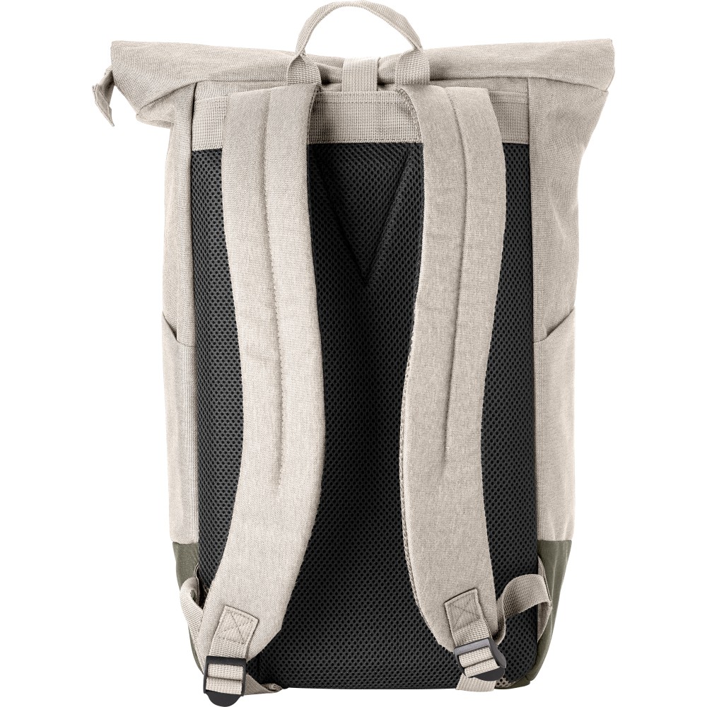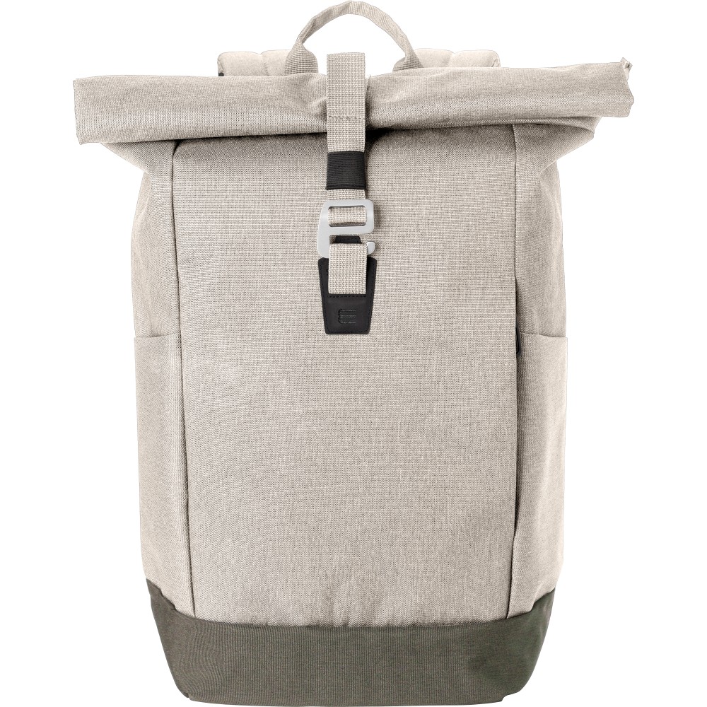 Poliészter (600D) rolltop hátizsák. Egy nagy cipzáras rekesz két csúszózsebbel és egy laptop rekesszel. Cipzáras rekesz elöl. Párnázott hátoldal és pántok. Fémhorog a záráshoz.