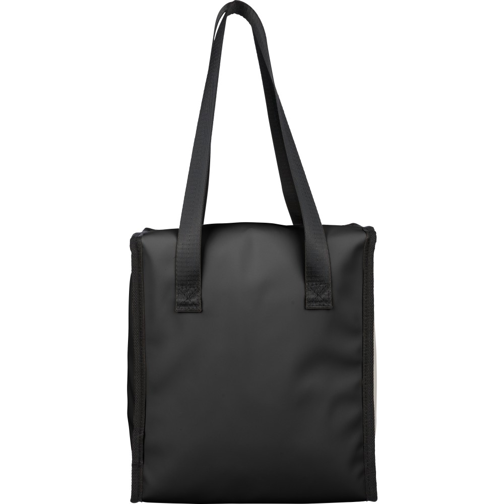 Újrahasznosított PU anyagból készült hűtőtáska 9 literes űrtartalommal, 210D újrahasznosított poliészter béléssel. 2,5 × 66 cm méretű hosszú fülekkel és elülső tárolózsebbel rendelkezik. A belső címkén újrahasznosított alapanyagra utaló logó található.