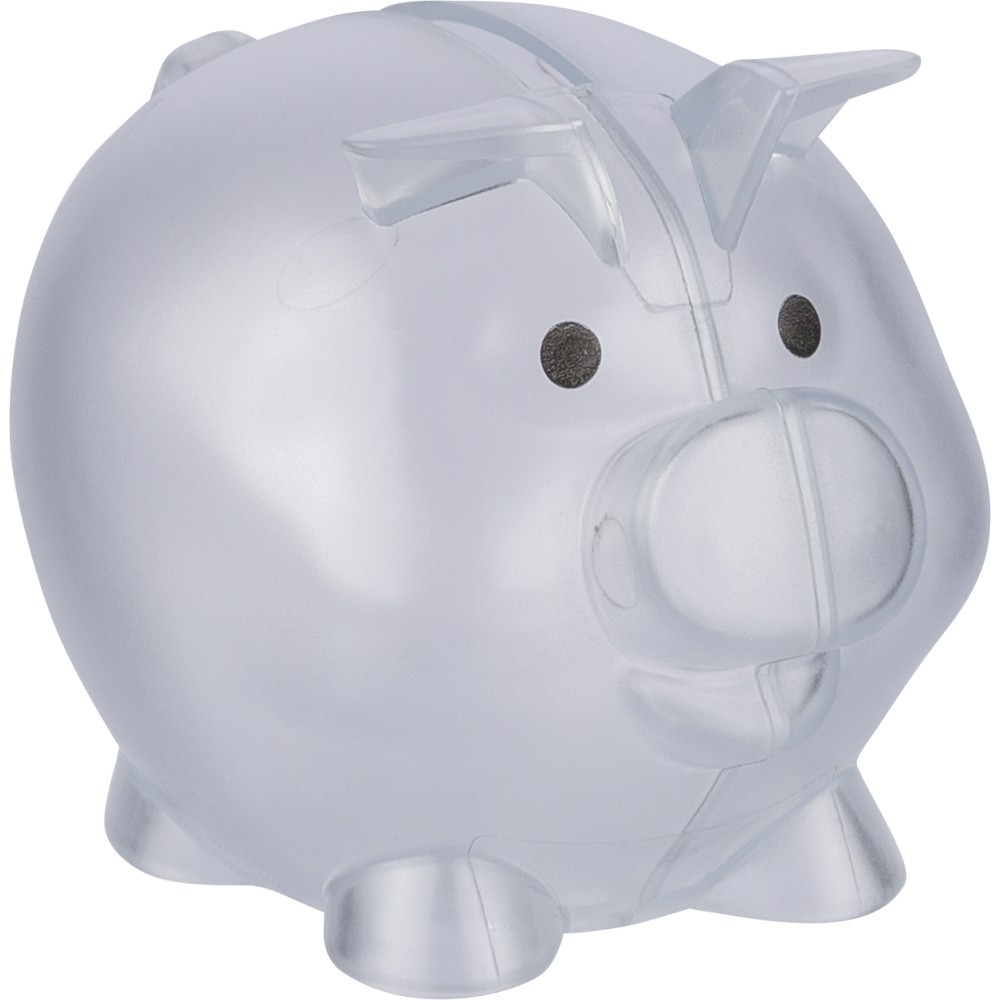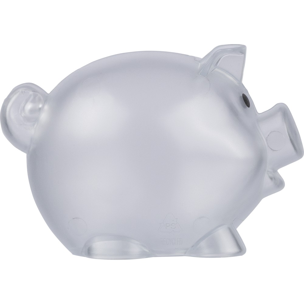 Újrahasznosított PS műanyagból készült, malacpersely. A hátoldalon recycled (újrahasznosított) alapanyagra utaló logó található.