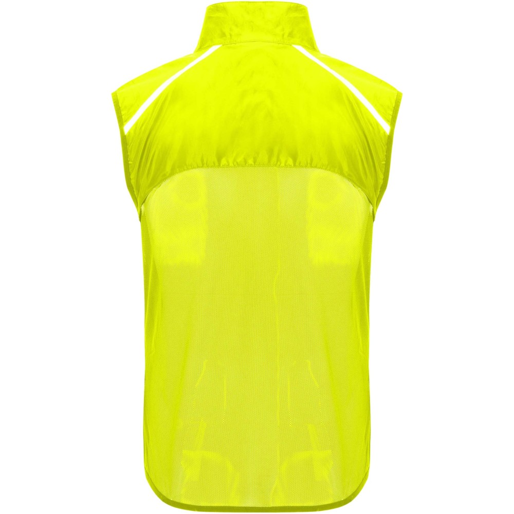 Szélálló és légáteresztő. Elülső cipzár azonos színű állvédővel. Rugalmas szegély a karkivágásnál és az alján. A hát alsó része mikroperforált anyagból készült. Fényvisszaverő csíkok a vállán. Zseb rugalmas pánttal, amelybe a mellényt el lehet csomagolni. Eltávolítható címke.