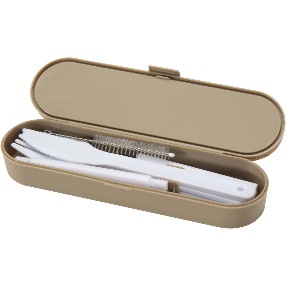 Újrafelhasználható evőeszközkészlet bambusz fedéllel, amely tartalmaz egy villát, kést, kanalat, szívószálat és egy szívószál tisztító kefét - ideális megoldást kínál az útközbeni étkezésekhez. Kompakt kialakításának és egyszerű tisztíthatóságának köszönhetően tökéletes kiegészítő uzsonnás dobozok mellé, utazáshoz vagy irodai használatra.