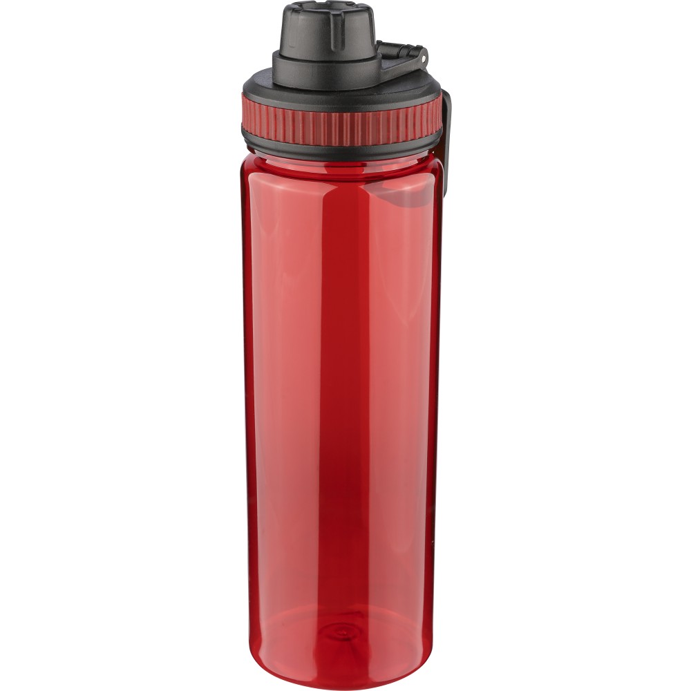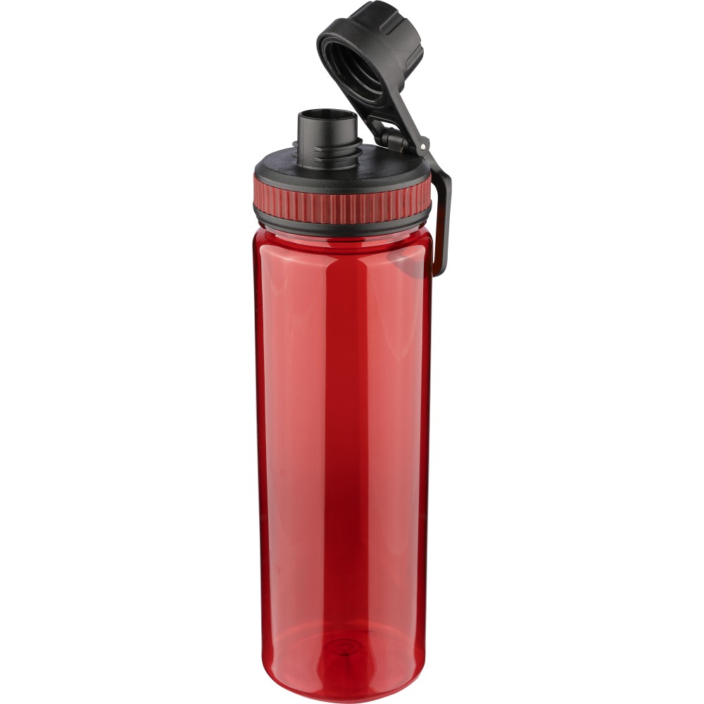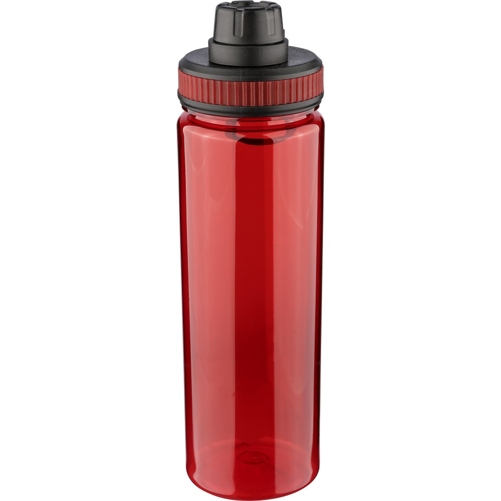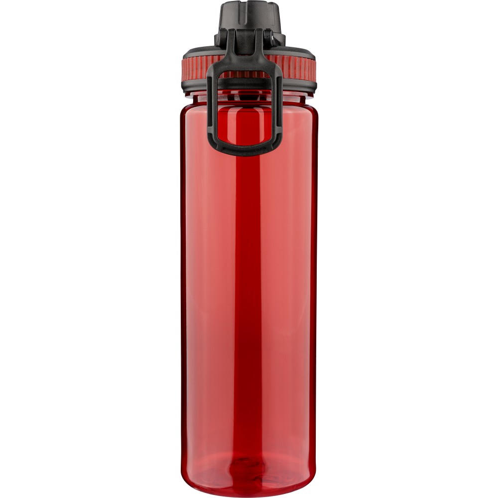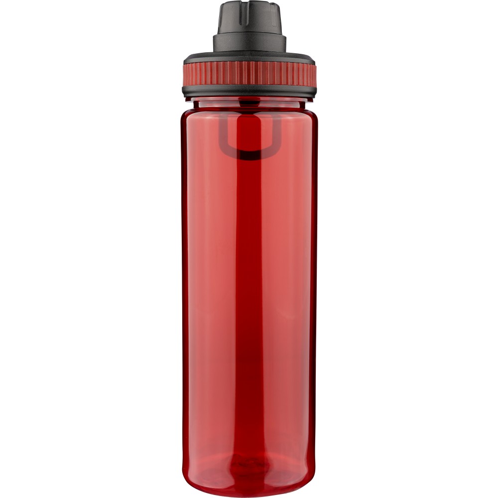 RPET anyagból készült ivópalack PP kupakkal, amely hordozófüllel és csavaros záródással rendelkezik, valamint a palack áttetsző testének színével harmonizáló szilikon díszítéssel. Űrtartalma 750 ml.