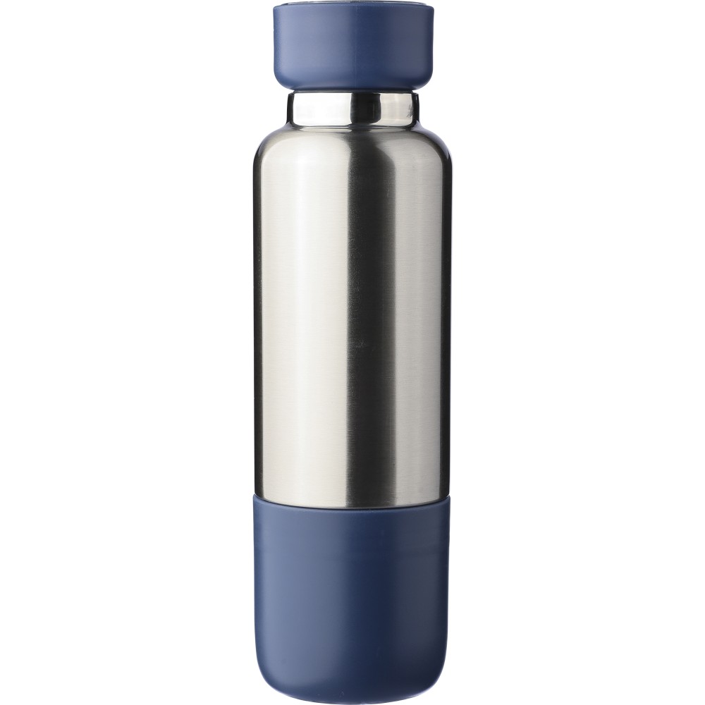 Duplafalú rozsdamentes acél kulacs, 500 ml-es. 304-es rozsdamentes acél belsővel és 201-es rozsdamentes acél külsővel. Átlátszó rekesszel ellátott PP csavaros kupakkal, cserélhető poliészter csuklópánttal, valamint egy 200 ml-es PP pohárral az alján. Ezüst színű felület matt részletekkel. Csomagolása barna papírdoboz.